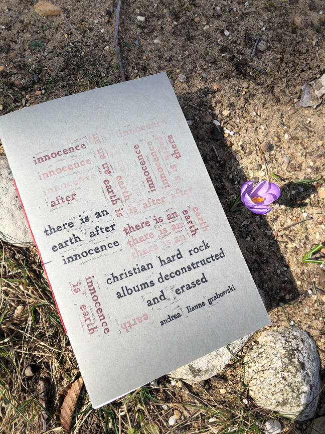there is an earth after innocence is a chapbook collecting nine erasure poems based off christian rock albums. using the lyrics of skillet, disciple, flyleaf, and others as vehicles for grappling with mental illness, queerness, and righteous anger at fundamentalism, the poems will resonate with anyone who used to listen to these bands and has since left them in the dust for a future of liberation.